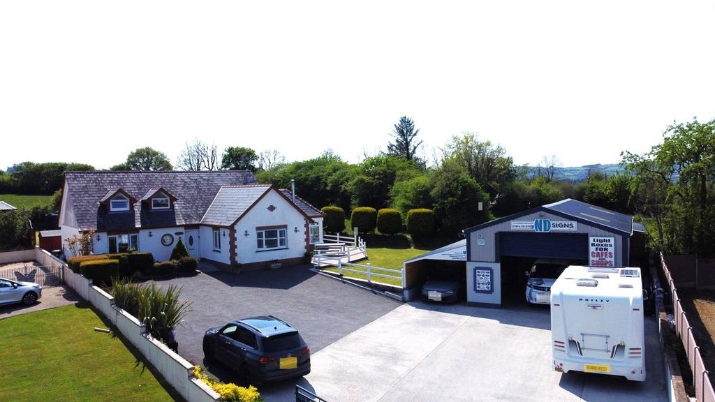 A superior residence individually architect designed to provide most attractive 3 bedroomed (2 bath roomed) accommodation. Large small business use commercial garage/workshop, ideal for the family setting up in business. 3 reception rooms including a sun room with woodburner, open plan well equipped kitchen/breakfast room. The grounds are well kept and mainly low maintenance releasing time not only for work but also play with a outdoor BBQ area and bar area room for gym, office or chilling area looking out onto the open field to the rear. The property itself is tastefully presented and in excellent decorative order. Two windows have stained glass finish one with Welsh dragon motif. The outbuilding has work area, kitchenet, toilet and offers 550 square feet of area within. Large concrete and tarmac area is offered for ample parking and turning area. A superb family home with internal viewing highly recommended.