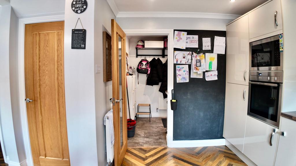 As you arrive, you are greeted by a private driveway leading up to the house. Stepping through the small entrance hall, you'll find a convenient WC, perfect for guests. The property boasts beautifully presented living accommodation, enhanced by stunning solid oak flooring throughout the ground floor. This premium feature adds a sense of warmth and elegance while offering durability and timeless style—perfect for modern family living and entertaining alike. The open plan receptions are a delightful surprise, featuring a stunning log burner as the focal point, creating a warm and inviting atmosphere for gatherings with family and friends.