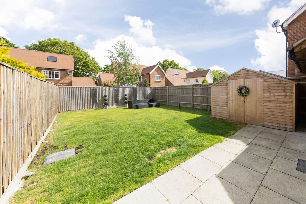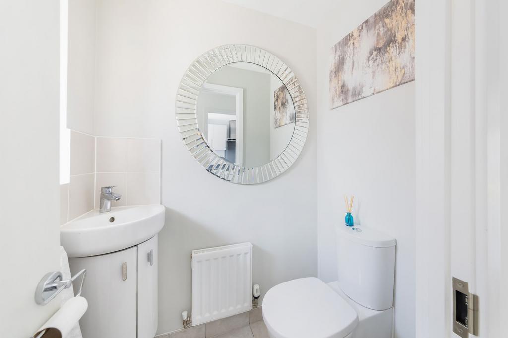 As you enter, you'll be greeted by a welcoming entrance hall featuring Amtico flooring and a convenient cloakroom. The front aspect modern fitted kitchen comes equipped with a range of integrated AEG appliances and an induction hob. The comfortable living/dining room at the rear is perfect for relaxing and entertaining, with double doors that open up to the rear garden.