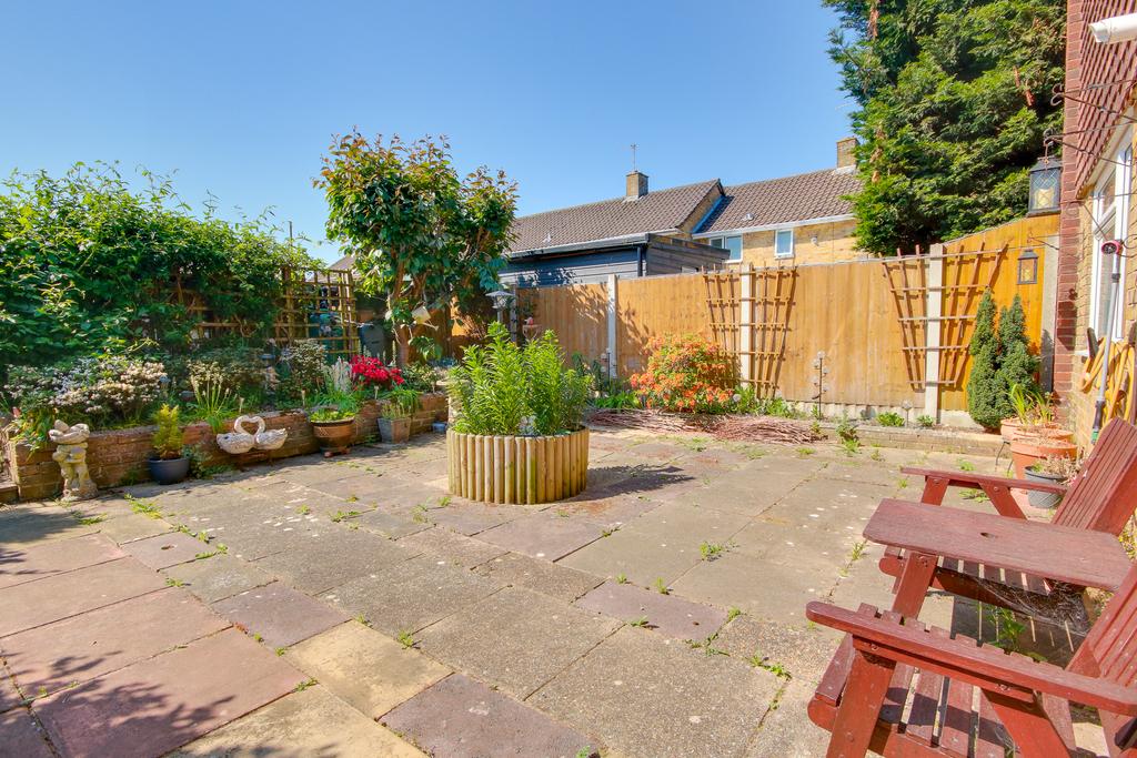 Fence enclosed, low maintenance garden with shrub boarders, shed, outside tap.