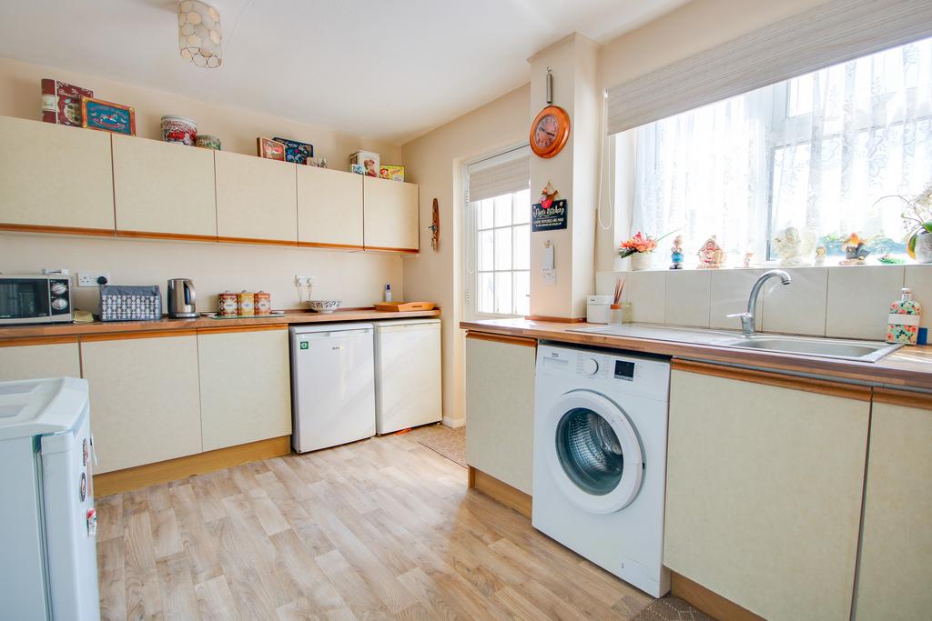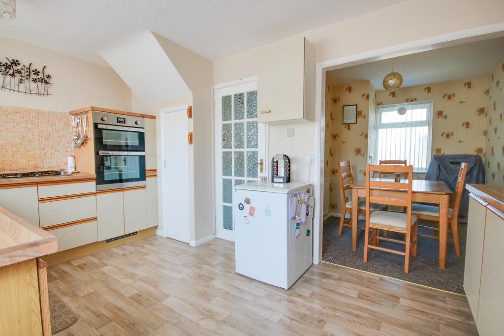 Textured ceiling, double glazed window to rear, door to rear leading into garden, range of wall, base and drawer units with work surface over, sink and drainer inset, built-in oven and gas hob, space for fridge/freezer, washing machine, opening to: