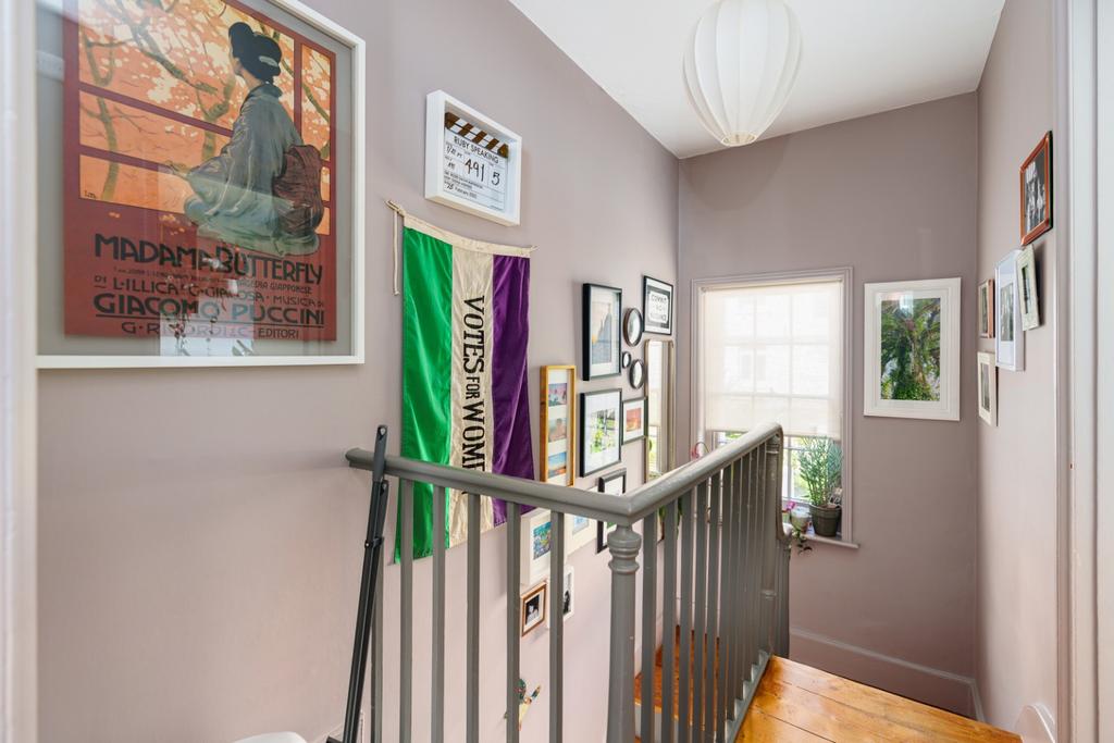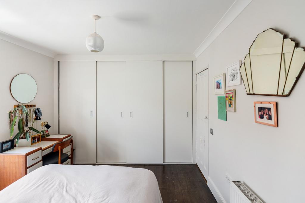 The top floor features a bright landing with a window and access to loft space, offering additional storage opportunities. The bathroom is a luxurious sanctuary, fitted with a freestanding bathtub, a separate spacious shower enclosure, a vintage-style WC and sink, and a contemporary radiator/towel warmer. The exposed wooden flooring and multi-paned sash window add to its appeal, creating a spa-like retreat within the home. The generously sized main bedroom is fitted with a range of wardrobes and a double-glazed wooden sash window. This room showcases the perfect blend of modern updates and traditional aesthetics.