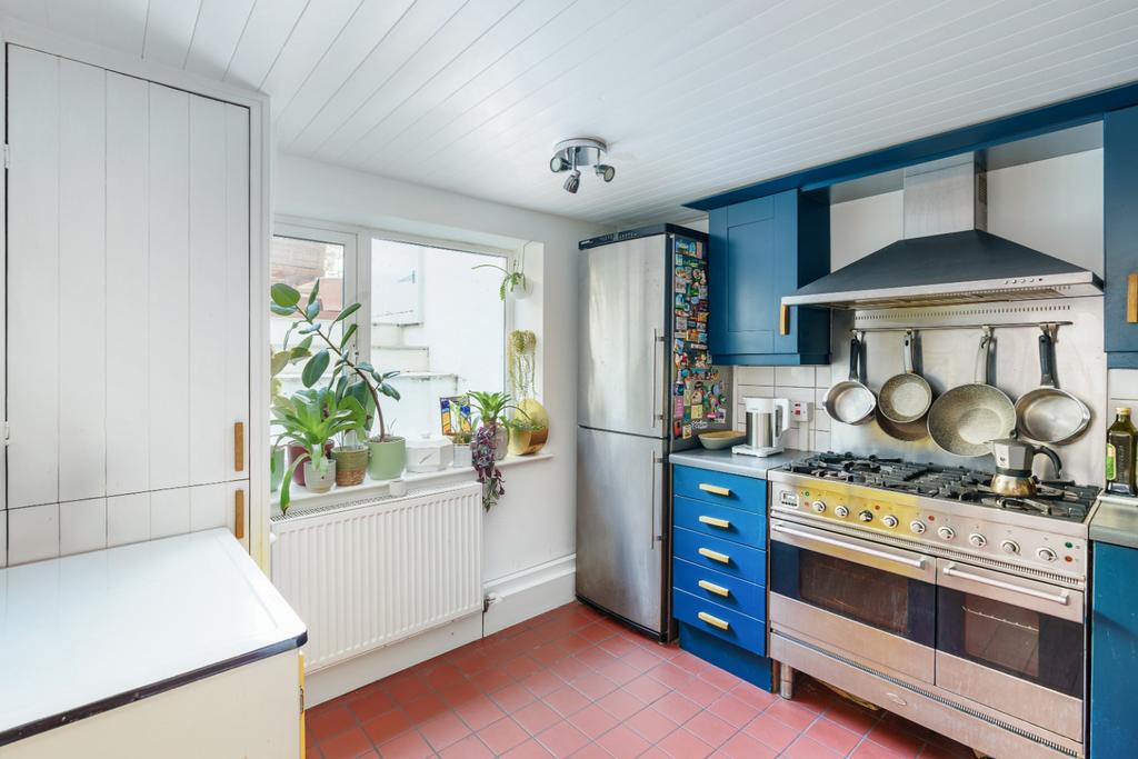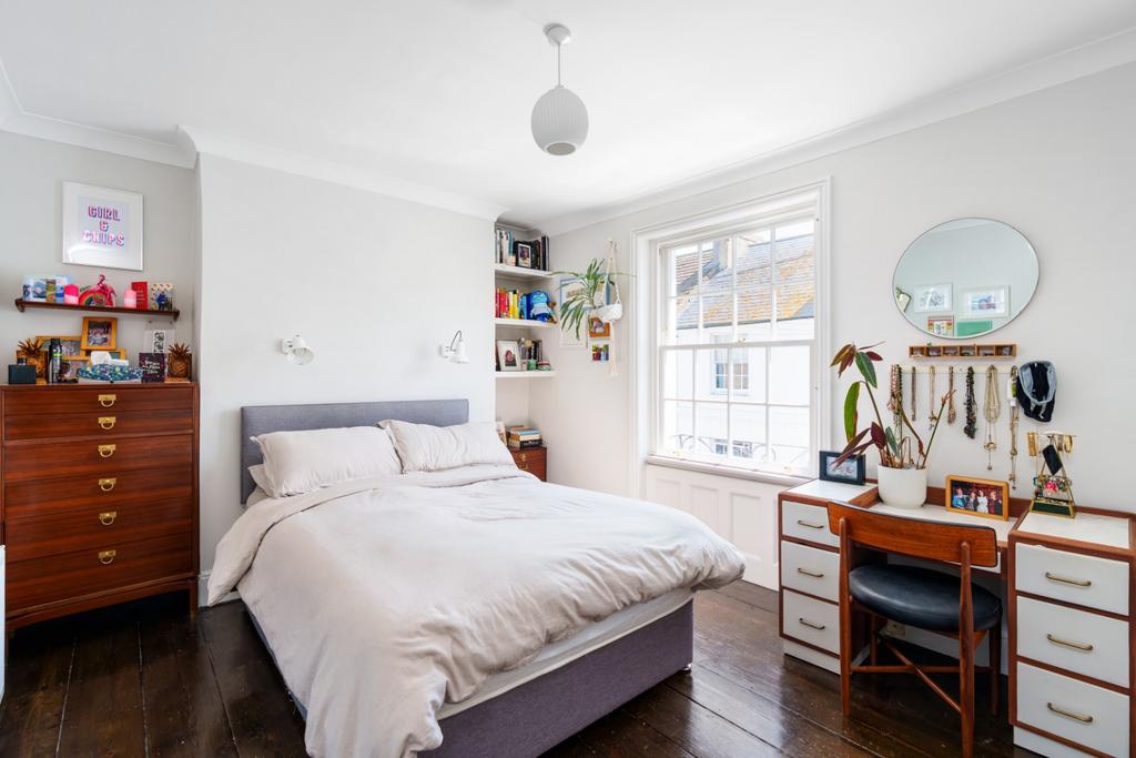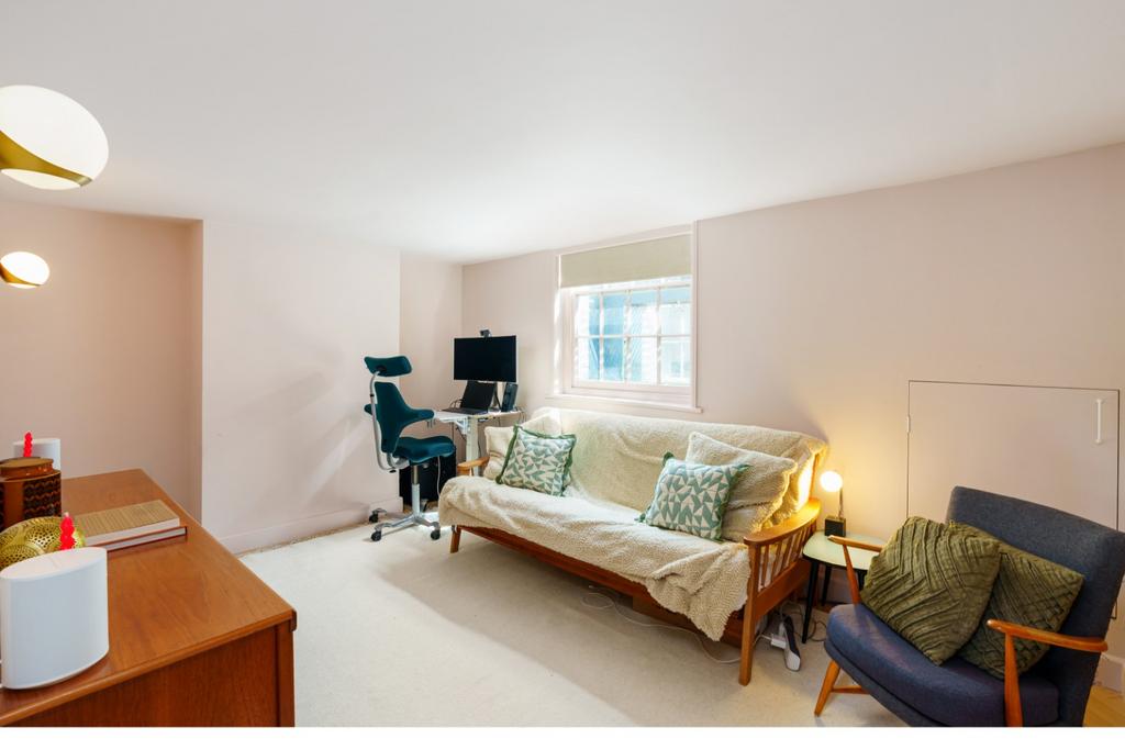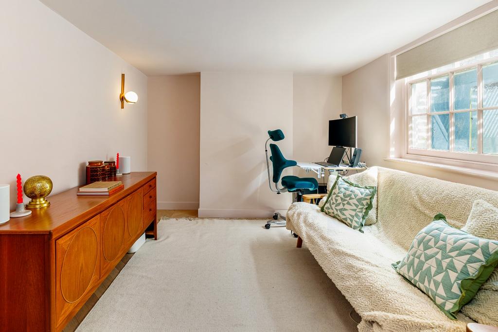 Descending to the lower floor, you will find the kitchen—a practical and stylish space that has been thoughtfully designed with ample storage in the form of numerous cupboards and a built-in cupboard. The kitchen comes equipped with a range cooker, complete with an extractor fan overhead, and an inset porcelain sink. A double-glazed window overlooks the west-facing garden, inviting plenty of natural light into the space and creating a pleasant atmosphere for cooking. This level also has the second bedroom, currently used by the current owners as their snug/office. It benefits from underfloor heating, exposed wooden flooring, and a sash window. Additionally, the old coal hole has been damp-proofed, providing an excellent recessed storage solution.