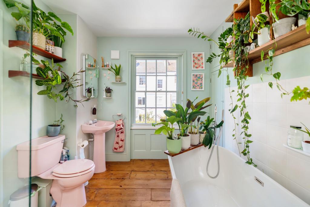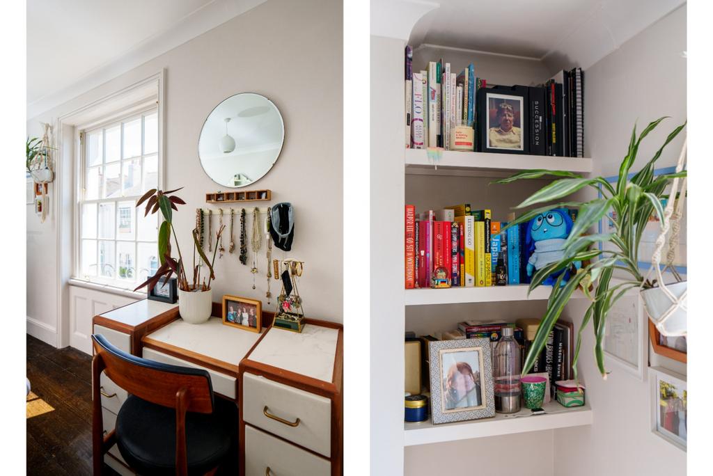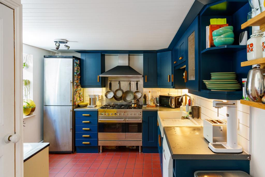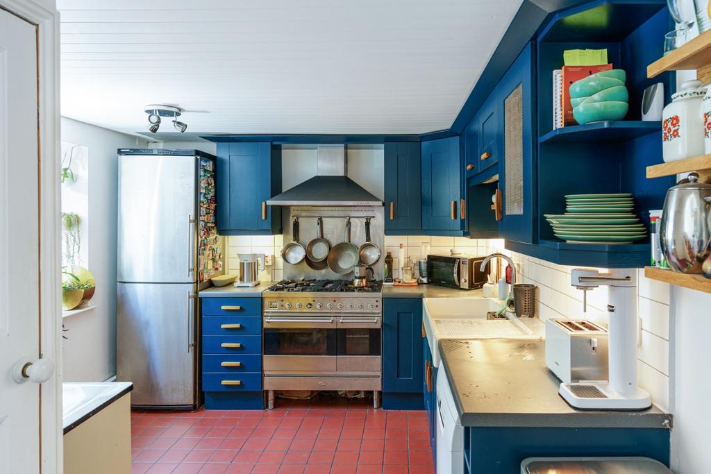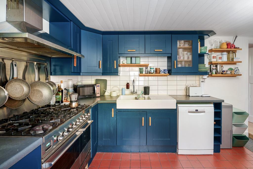 Descending to the lower floor, you will find the kitchen—a practical and stylish space that has been thoughtfully designed with ample storage in the form of numerous cupboards and a built-in cupboard. The kitchen comes equipped with a range cooker, complete with an extractor fan overhead, and an inset porcelain sink. A double-glazed window overlooks the west-facing garden, inviting plenty of natural light into the space and creating a pleasant atmosphere for cooking. This level also has the second bedroom, currently used by the current owners as their snug/office. It benefits from underfloor heating, exposed wooden flooring, and a sash window. Additionally, the old coal hole has been damp-proofed, providing an excellent recessed storage solution.