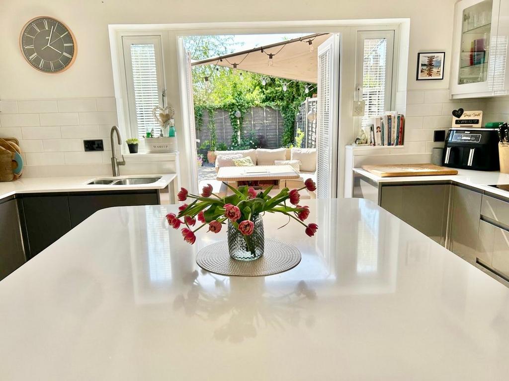The kitchen is filled with light from the double patio doors which open out into the garden.
