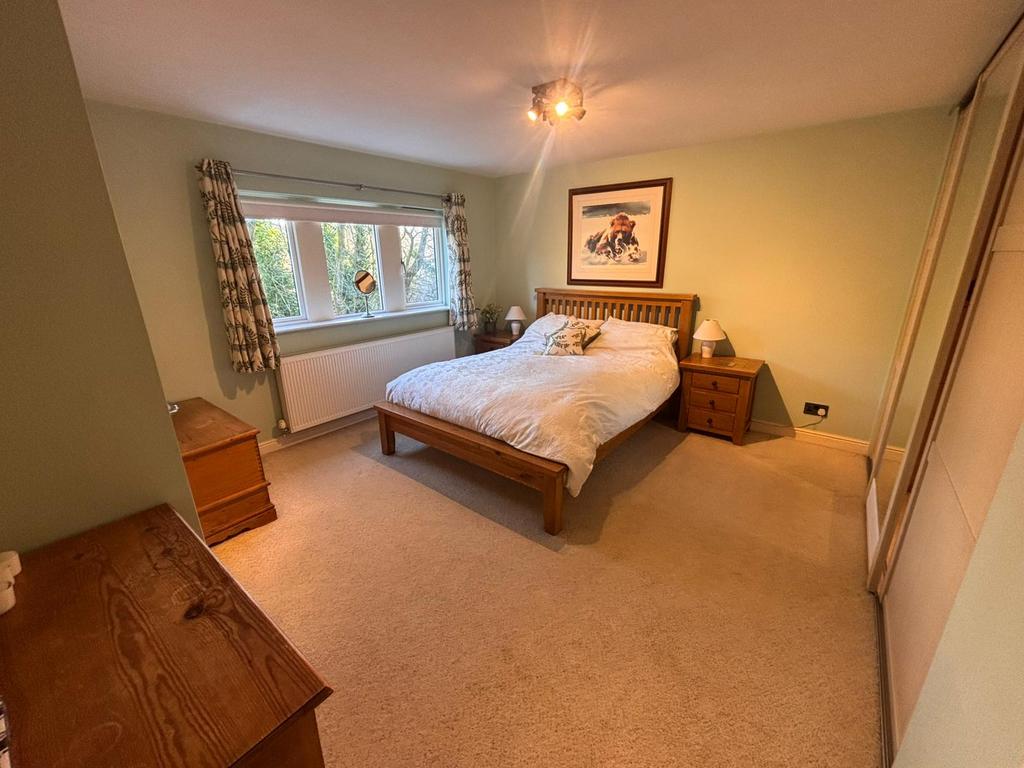 A large master bedroom that features ample space for a king sized bed along with additional bedroom furniture. The bedroom benefits from a large walk-in style wardrobe, separated by a sliding mirrored door, creating plenty of storage space. The room has a carpeted floor, central light fitting, double radiator and a uPVC double glazed window that overlooks the woodland to the rear elevation.