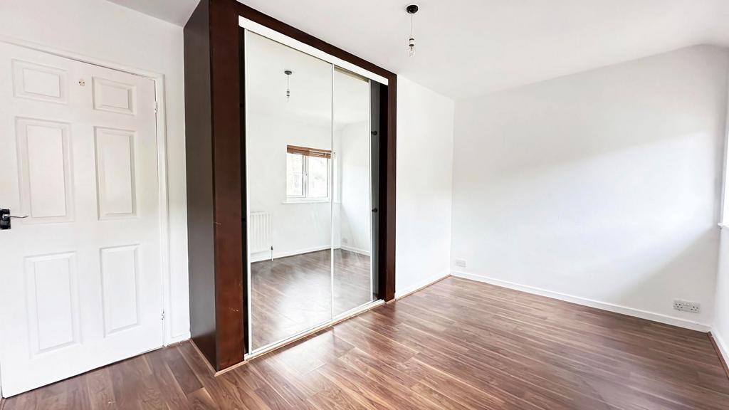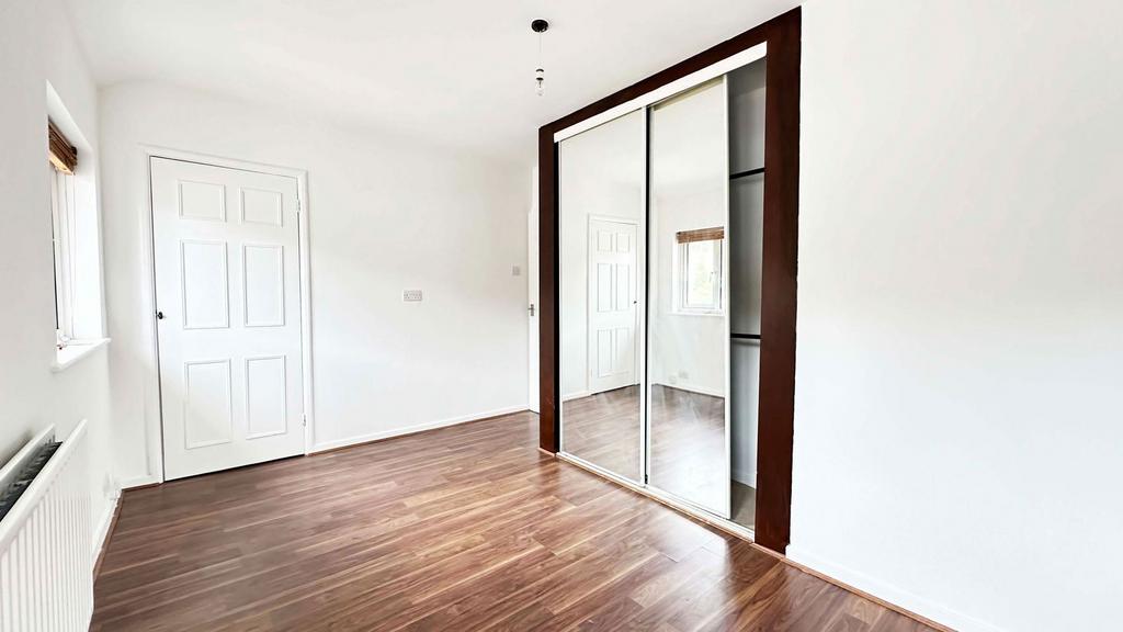 Bedroom 1 – 13’3” x 10’ – Two double glazed windows to front, laminate flooring, 1 x radiator, storage cupboard, fitted mirror wardrobe