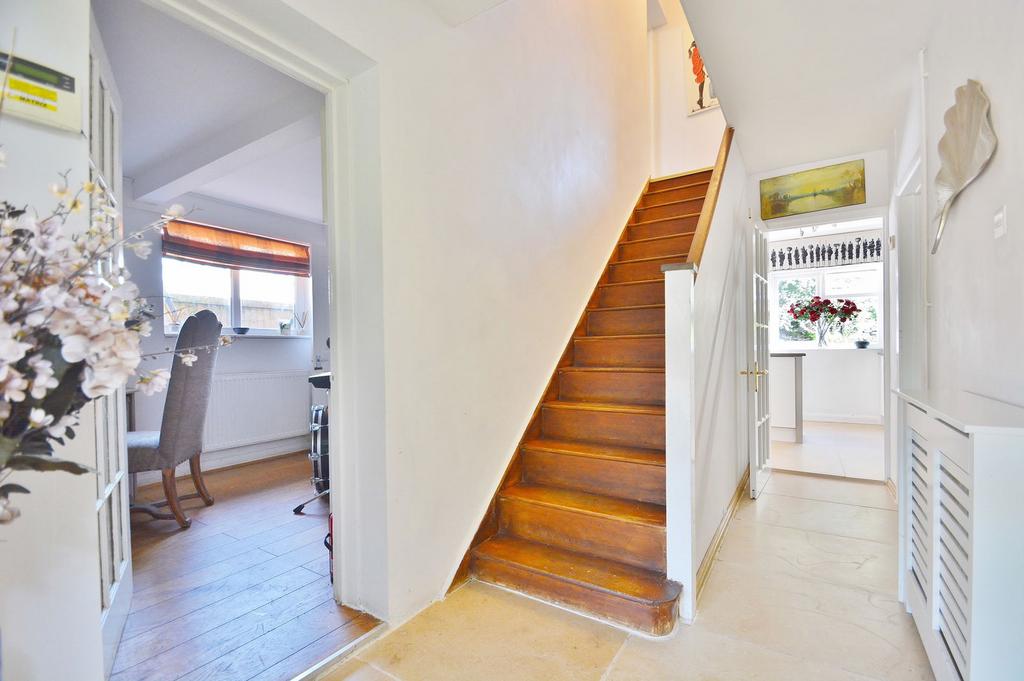 The ground floor includes a spacious limestone floored entrance hallway, a large lounge/dining room with an open fireplace, a modern kitchen with Travertine flooring, granite worktops and a central island, and a versatile study or fifth bedroom with a cloakroom. The kitchen opens directly onto a private, low-maintenance rear garden.