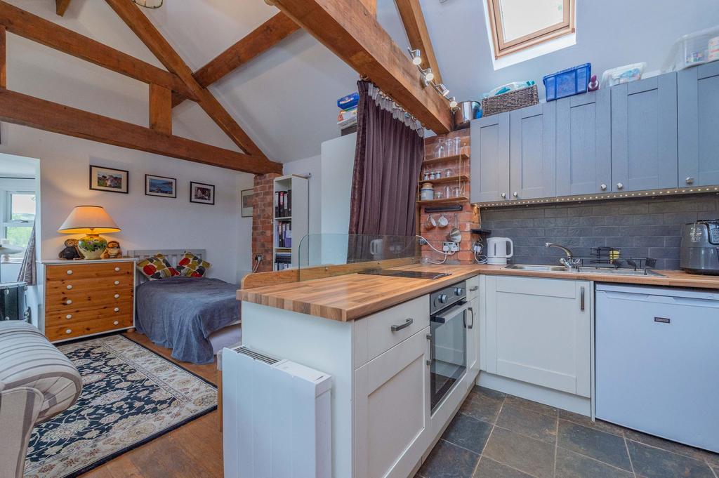 This charming, converted cow shed now serves as delightful open-plan studio accommodation. Brimming with character, Haymakers Cottage features vaulted ceilings, exposed stone and beams, and a multi-fuel burning stove creating a warm and inviting atmosphere. It includes a well-equipped kitchenette and en-suite facilities, and benefits from disabled access, making it versatile guest accommodation or a potential holiday let.