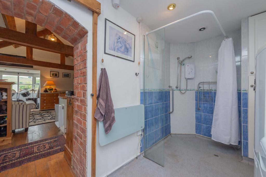 Currently registered for commercial use, The Gleanings is another impressive open-plan studio. It features a kitchenette and a shower room. A true highlight is its glazed doors opening onto a private decking area, specifically designed to capture the stunning panoramic views over the property's extensive pasture land and beyond to the dramatic silhouette of The Stiperstones and the surrounding rolling hills. This space offers incredible potential for a variety of uses, subject to relevant permissions.