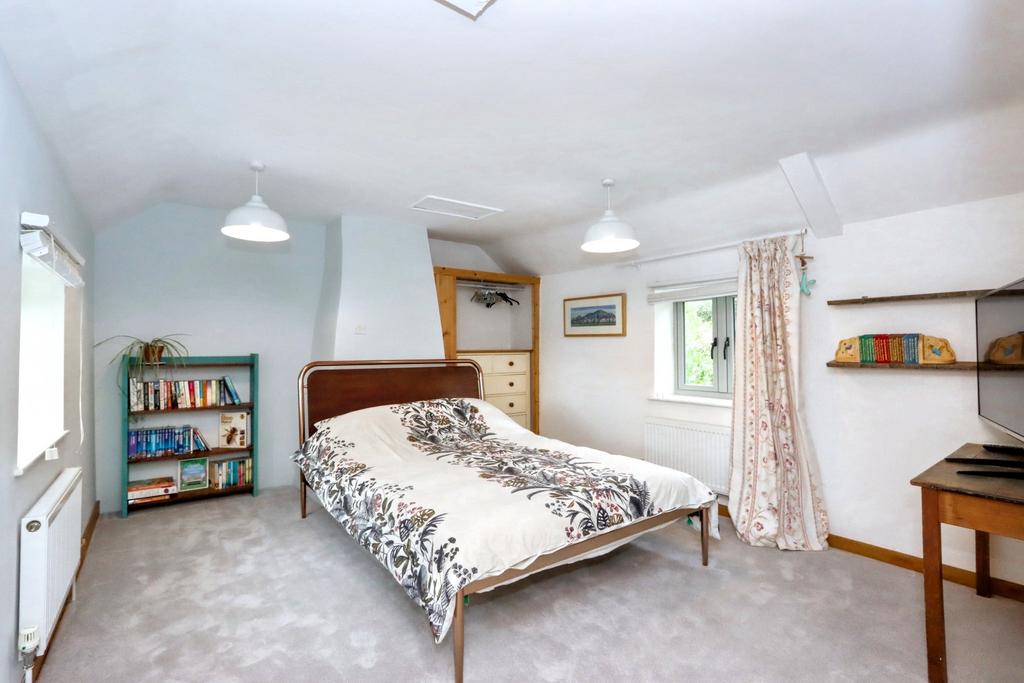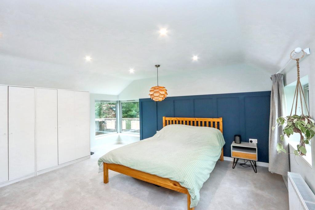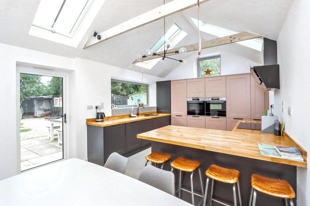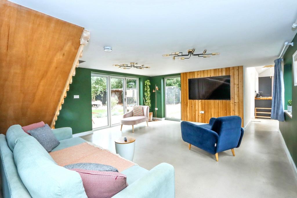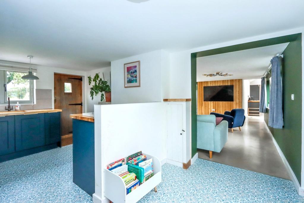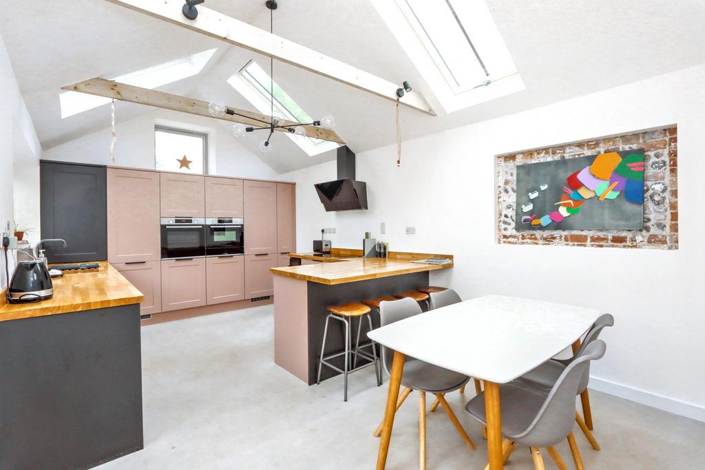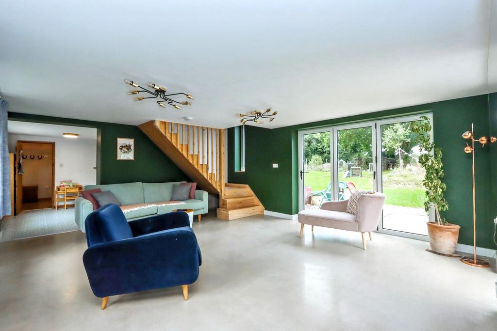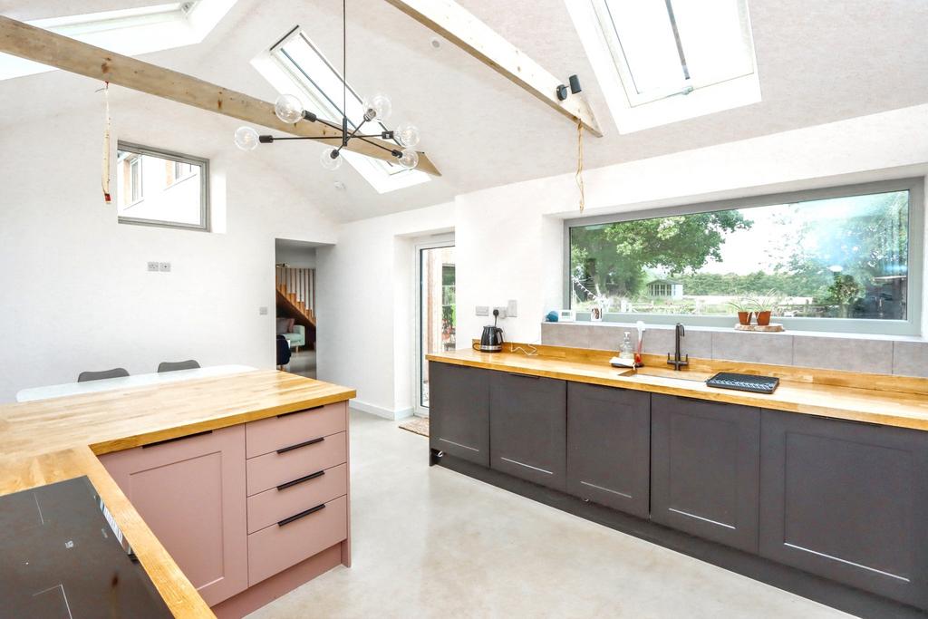 Entering the front of the property you find the entrance hall with access to the lounge which could be an ideal snug with fireplace and log burner emphasising the historic character of the property. From here you walk through the utility room, fitted with integrated washing machine and tumble dryer, into the newer part of the house consisting of a large family living space and kitchen beyond. This part of the house, with its polished concrete flooring, offers bi-fold doors out via decking to the rear garden whilst the impressive kitchen with vaulted ceiling and Velux style windows offers everything you could need. The kitchen includes of a range of base and wall mounted units as well as two integrated electric ovens, warming draw, electric induction hob with extractor over, ceramic sink, integrated dishwasher, integrated fridge and freezer and wood block work surfaces.
