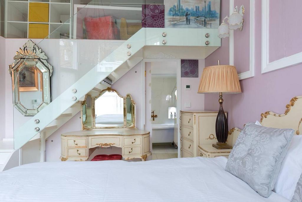 The living room and master bedroom feature large windows and high ceilings, providing tonnes of natural light to the flat. The windows feature silk curtains and wooden shutters.