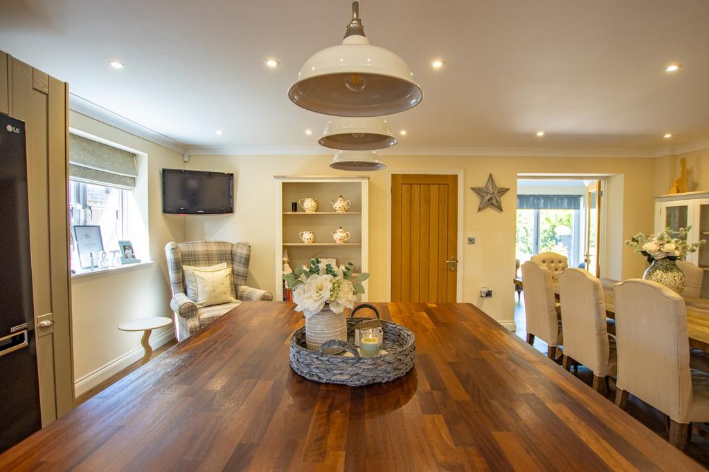 Visitors are welcomed into the spacious reception hall, where there is a staircase rising to the first floor landing and a door into the ground floor cloakroom. The open-plan kitchen/dining room is very much at the heart of the ground floor, providing plenty of space for a large table with chairs alongside the fitted kitchen and island unit. The kitchen comprises an extensive collection of fitted drawers and storage units under solid walnut work surfaces, with a matching central island. Integrated appliances include a 5-ring induction hob, twin ovens, dishwasher, bin store and wine chiller. From the kitchen there are two pairs of double doors which open to the garden room and the family sitting room.