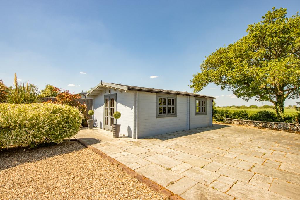 The property is located in the corner of a small four house development, with parking and turning space for several vehicles in front of the garage and carport. The garage is of brick construction, with an electrical power supply and double doors to the front. Double gates at the side of the house give access around to the delightful rear garden, which measures around 140ft in length, from the back of the house. The gardens have been beautifully landscaped and lovingly maintained, with a central expanse of lawn separating two large entertaining areas. Immediately to the rear of the garden room there is a sandstone terrace, which provides the perfect place to enjoy a barbecue or evening drinks. A resin path winds down the garden to the cabin, around which there is another large section of paving with stone gabion seating around the perimeter. The cabin, which has a toilet and hand basin, adds another dimension to the accommodation; whether used as a games room, office or art studio, among many other possibilities. From the bottom of the garden, there is a delightful view over the adjoining farmland.