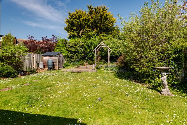 REAR GARDEN: laid to lawn with flower and shrub borders, paved patio area, conifer trees, water tap, side access.