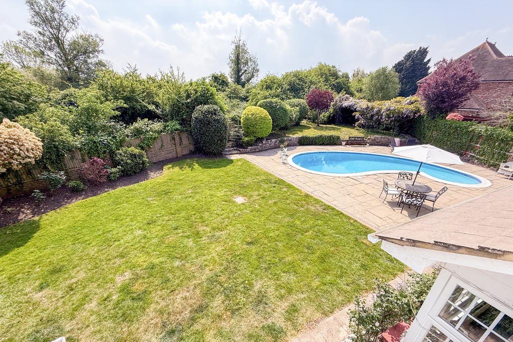 5 bedrooms | entrance reception | study | sitting room | dining room | kitchen | breakfast room | utility room | shower room | store | en-suite shower room | family bathroom | own driveway | south facing garden | heated swimming pool | gas central heating | double glazed windows