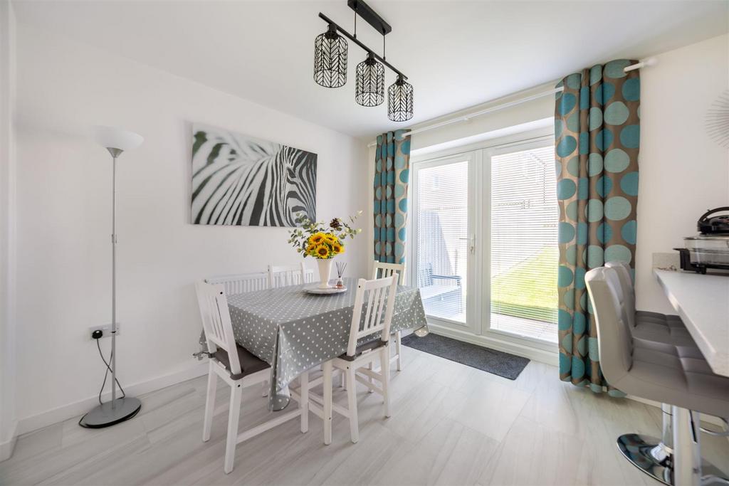 The kitchen/diner provides ample space for a dining table, French doors leading out to the rear garden, and under stair pantry for added convenience. The kitchen itself is fitted with wall and floor units, some integrated appliances including an oven, hob, and extractor fan, as well as space for additional appliances. A window overlooks the rear garden, and there is a breakfast bar incorporated into the kitchen layout.