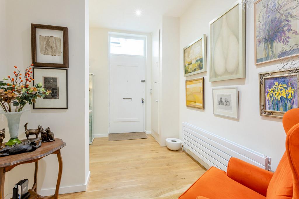 On the ground floor the property is approached by its own private entrance from the rear courtyard of Oxendon Hall. On entering you are greeted by a bright and welcoming entrance hall with high ceiling and oak floor, there is also a modern guest cloakroom. From the rear of the hallway steps lead down into the recently re-fitted kitchen, this a superb room with a high ceiling and French doors with shutters opening onto the private sun terrace. The kitchen has an extensive range of contemporary fitted units with contrasting work surfaces, integrated appliances comprising a gas hob with extractor above, electric oven, microwave, dishwasher and a fridge/freezer. Adjacent to the kitchen is the superb split level sitting/dining room which is beautifully light and airy with lofty high ceiling and three large sash windows to the front overlooking the private terrace and gardens beyond. This room is arranged with the dining area on the upper level with steps down into the sitting room.