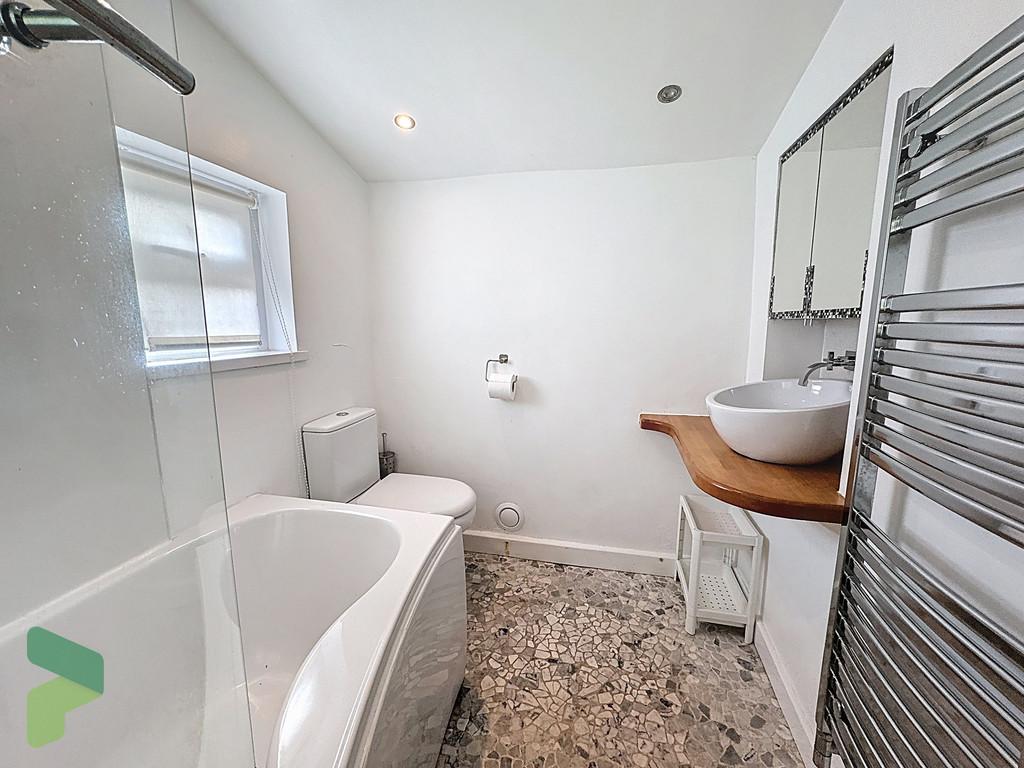 THREE PIECE BATHROOM Panelled bath with shower and screen, wash basin, WC, 2 PVC double glazed windows, chrome radiator/towel rail, spotlighting