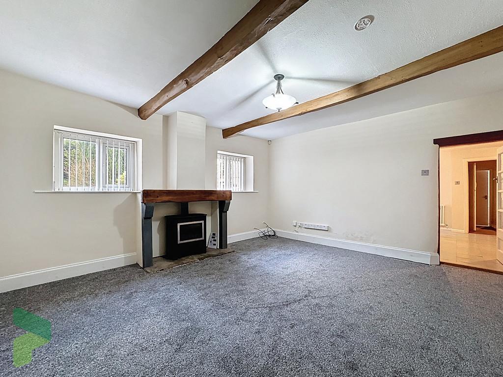 LOUNGE 15' 3" x 13' 5" (4.65m x 4.09m) Gas fire in fire surround, 2 PVC double glazed windows and original leaded door, beamed ceiling, carpeted, radiator