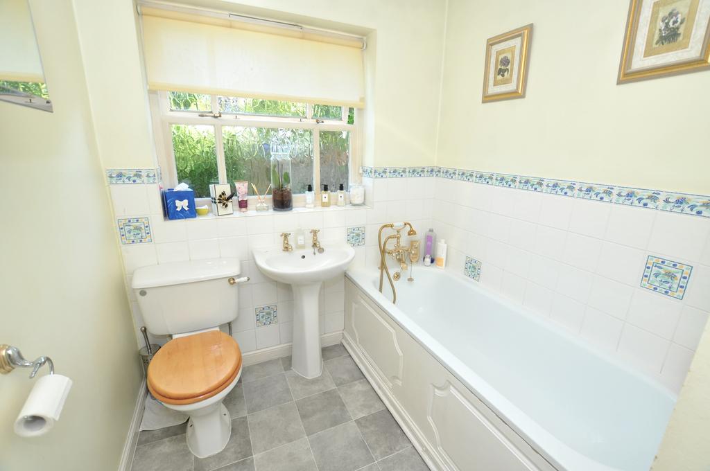 Bathroom: Double glazed window, panelled bath with mixer tap hand shower attachment, pedestal wash hand basin, low-level flush WC, extractor fan, wall mounted ladder style heated towel rail.
