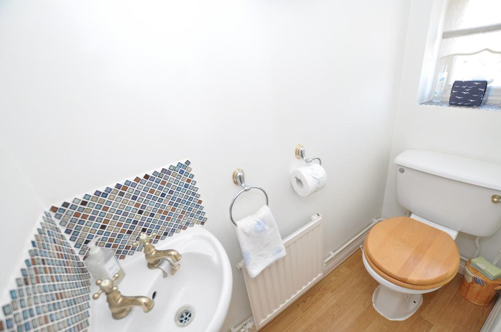 Guest WC: Low-level flush WC, central heating radiator, wood effect laminate flooring, corner wall mounted wash hand basin, double glazed window, double glazed window.