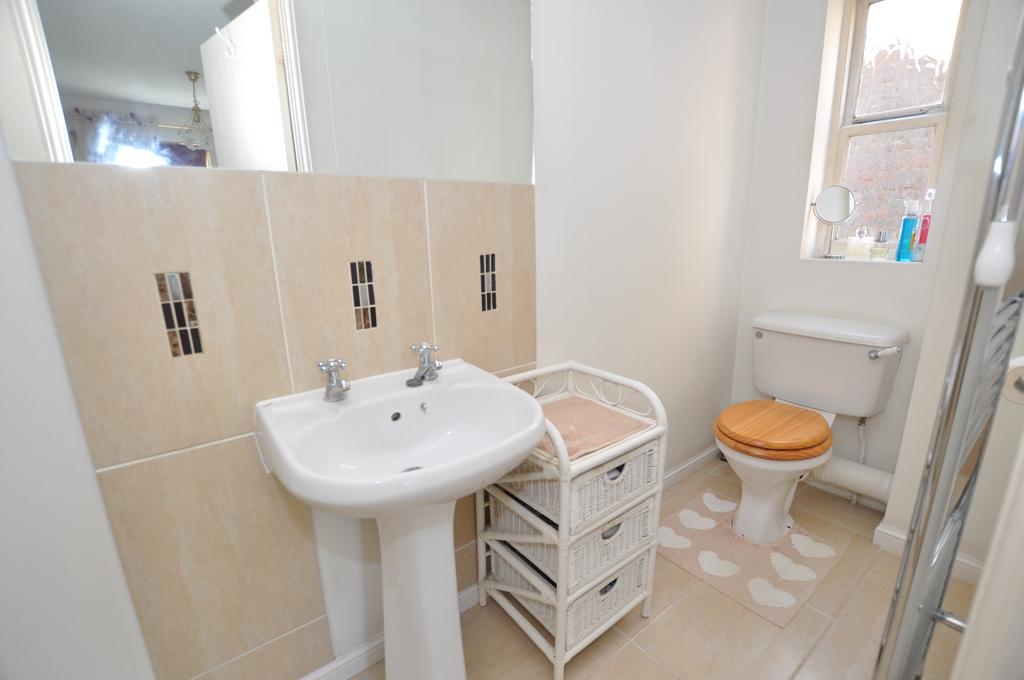 En-suite: Enclosed tiled shower cubicle, tiled floor, pedestal wash hand basin, low-level flush WC, wall mounted chrome ladder style heated towel rail, double glazed window.