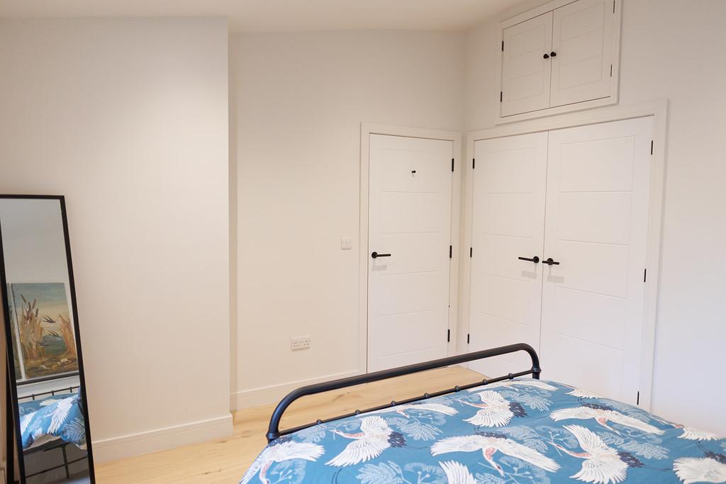 BEDROOM: Good areas of wood effect flooring. Ample space for a large bed and associated bedroom furniture. Higher level storage space and lower level wardrobe with areas of fitted coat rails and further general storage space, inset spotlights to the ceiling. Double glazed window to the front with fitted blind.