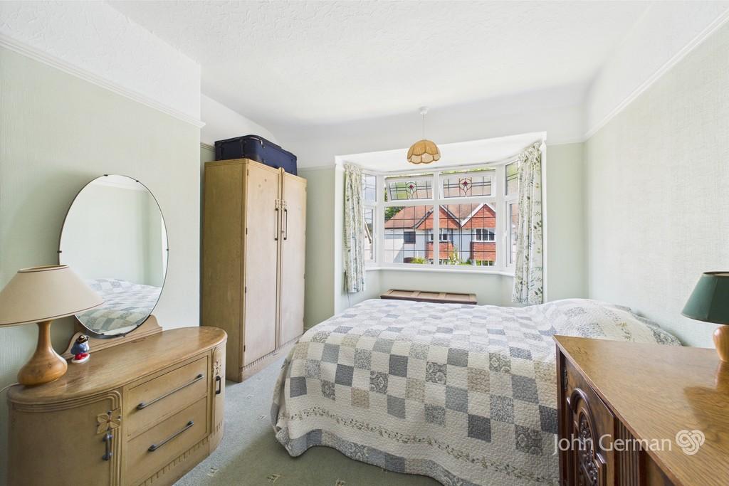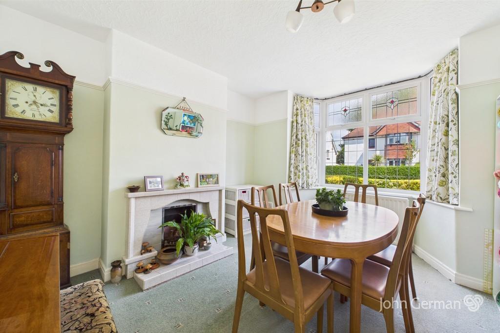 The separate formal dining room has a front facing bay window with stained upper lights and a tiled open fireplace.