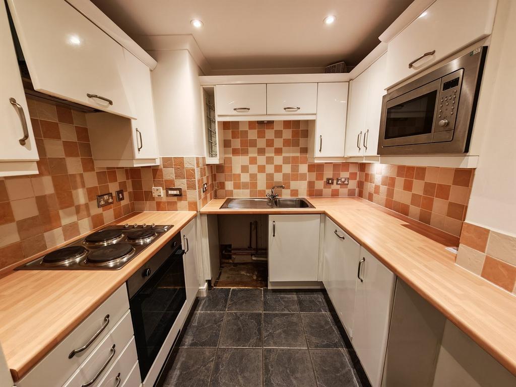 The lower-level kitchen is compact yet thoughtfully designed, fitted with a range of contemporary wall and base units, an electric hob and oven, an integrated fridge-freezer, and plumbing for a washing machine. Storage is well catered for with built-in wardrobes in two of the bedrooms and a large under-stair cupboard. The main bathroom is also generously proportioned and benefits from integrated storage solutions.