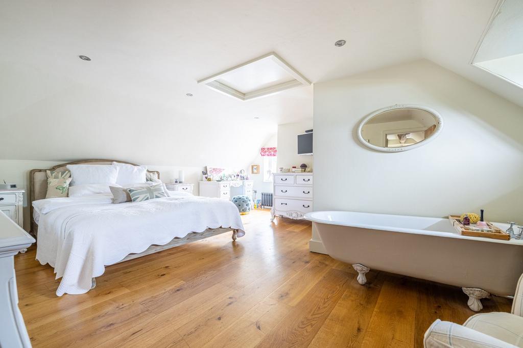 Upstairs there are four double bedrooms all with oak floorboards and doors. The master bedroom is of generous proportions and enjoys an en-suite shower room as well as a luxurious traditional roll top bath in the main room.