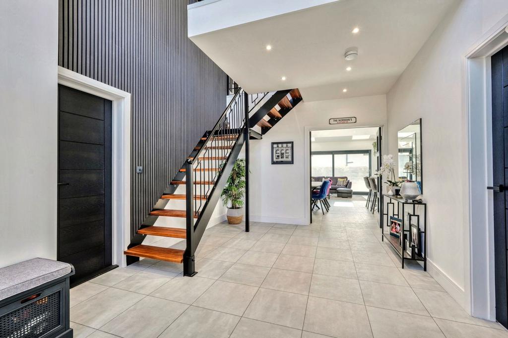 - Striking double-height hallway with mezzanine landing and full-height glazing that fills the space with light