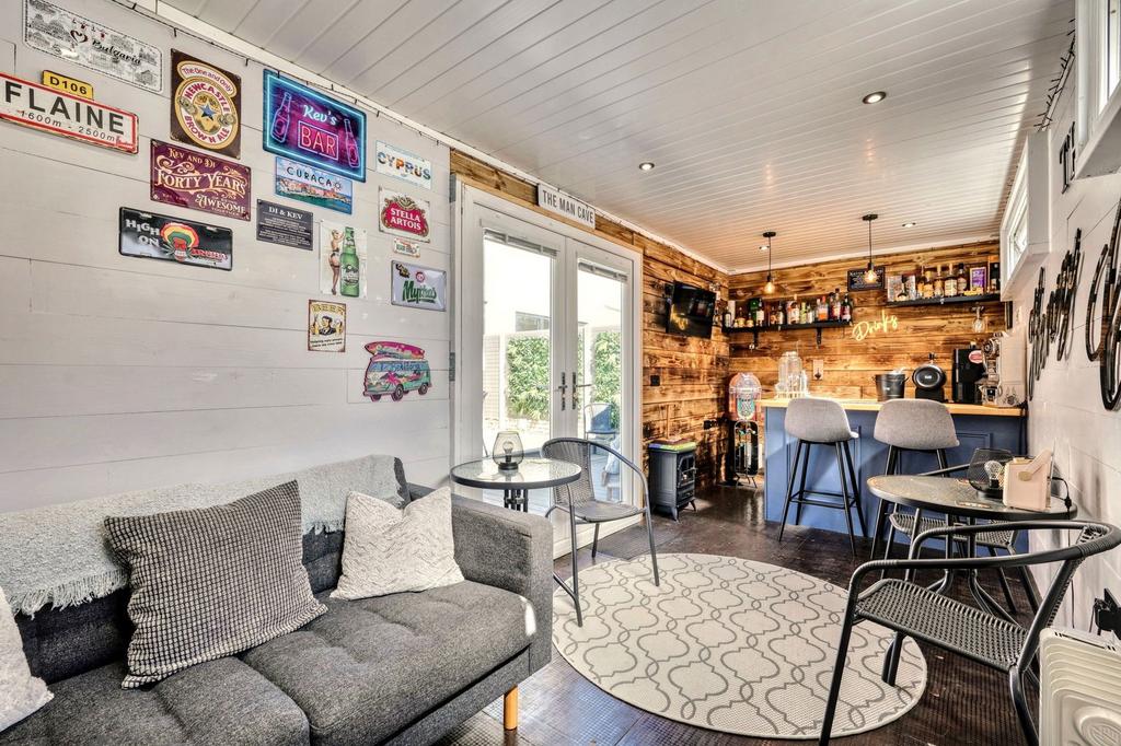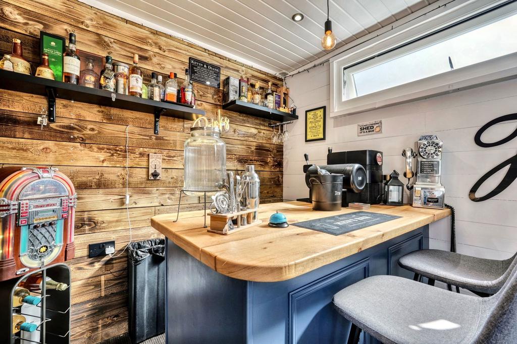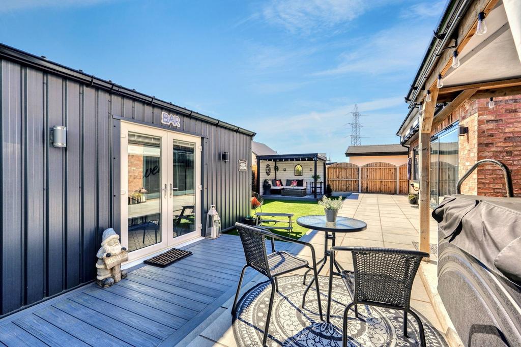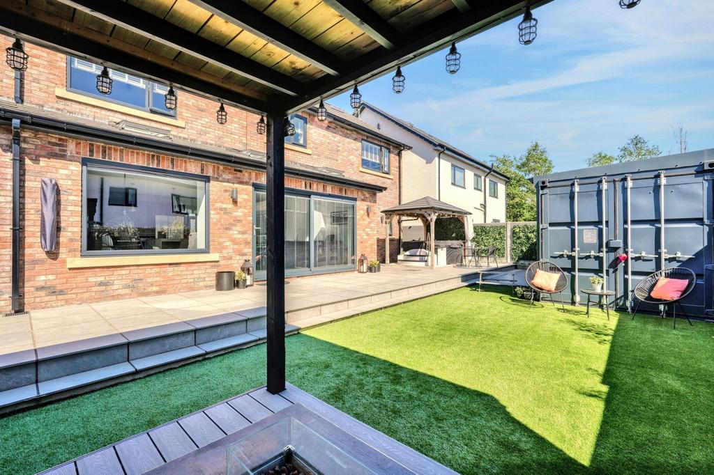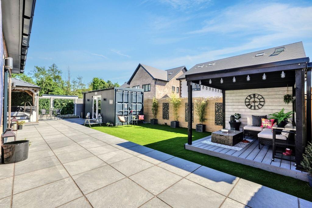 - South-facing garden with low-maintenance landscaping, raised pergola deck, hot tub and a show-stopping shipping container bar