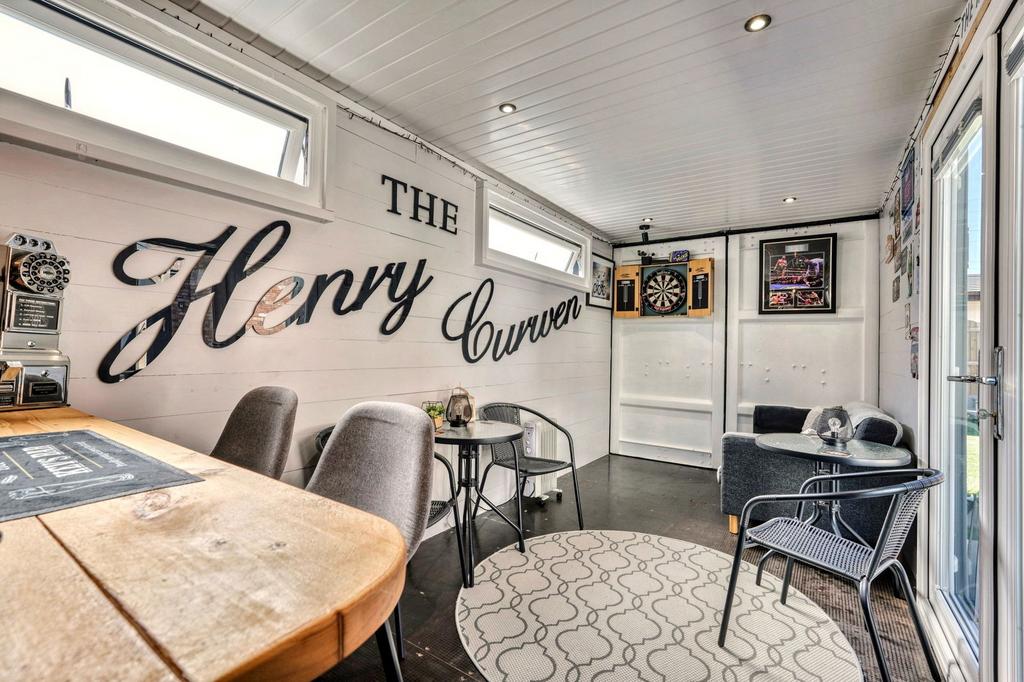 It took a crane to put it in place and it has French doors on the side and fully openable end doors (you know, like on a shipping container!) for sunny day darts tournaments.