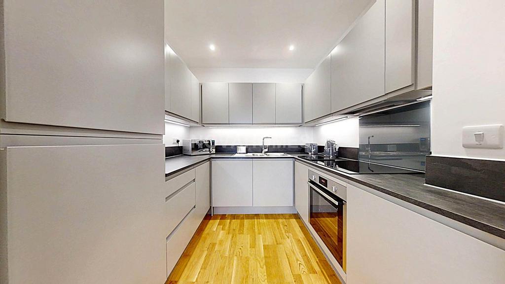Matching range of base and eye level storage cupboards with laminate worktops. Inset stainless steel sink and single drainer with mixer taps. Built in oven and induction hob with extractor hood over. Integrated fridge/freezer. Integrated dishwasher. Wooden flooring.