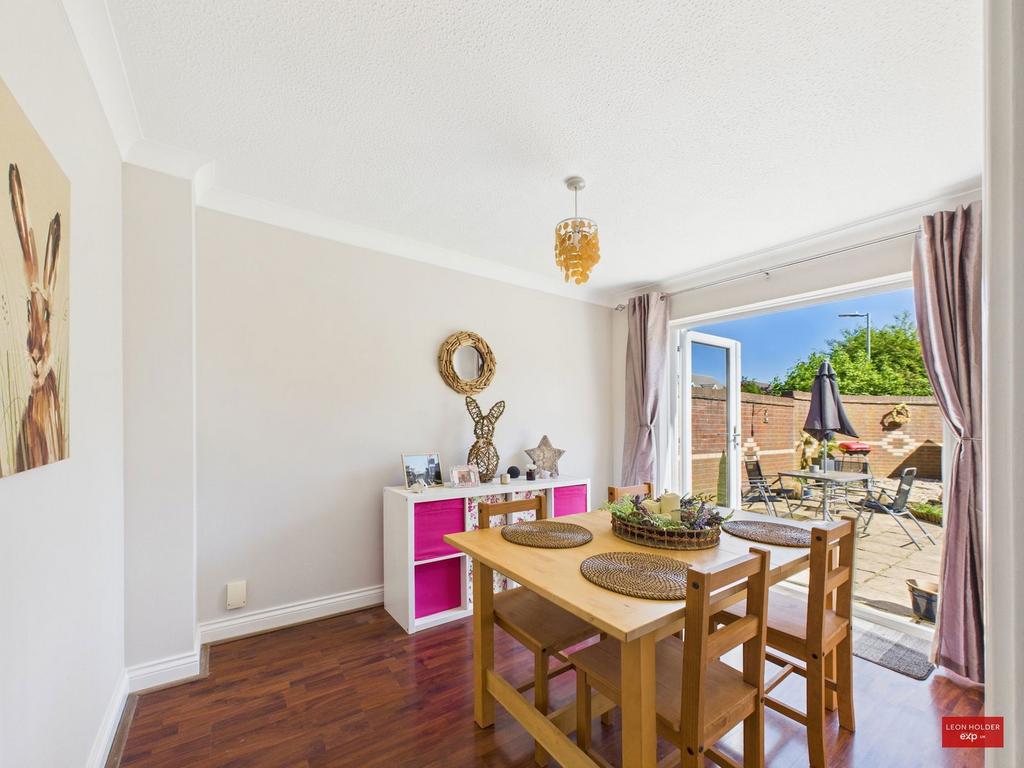 Approached via a private driveway with an integral garage, the home opens with a charming open-plan porch and a welcoming entrance hall. The ground floor accommodation includes a bay-fronted living room, a separate formal dining room with sliding doors out to the garden, a good-sized kitchen and breakfast room, and a dedicated utility room, along with a convenient downstairs cloakroom.