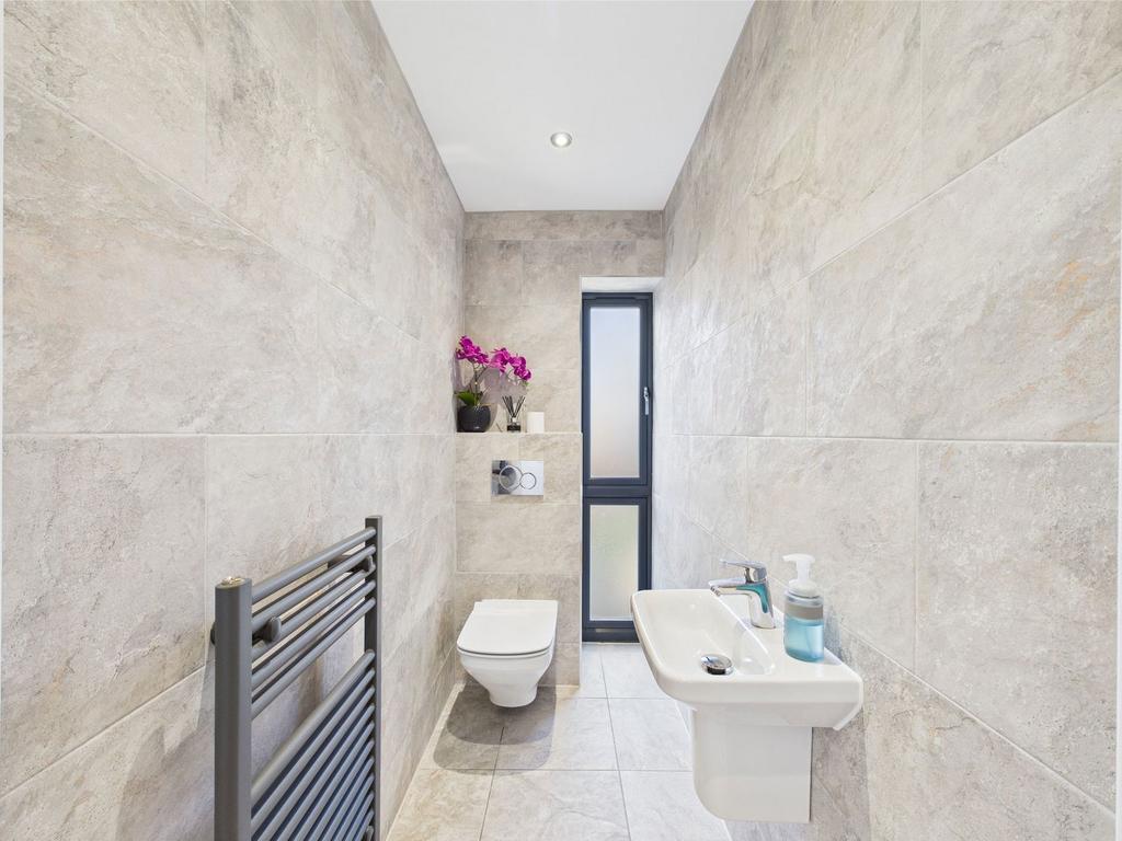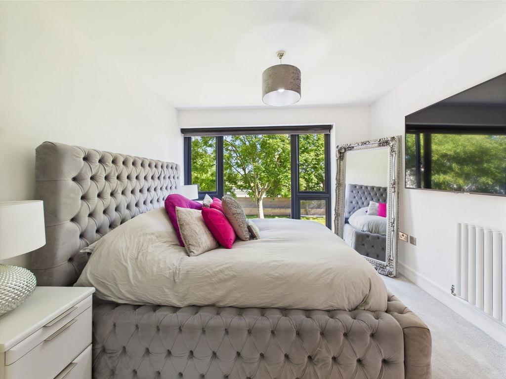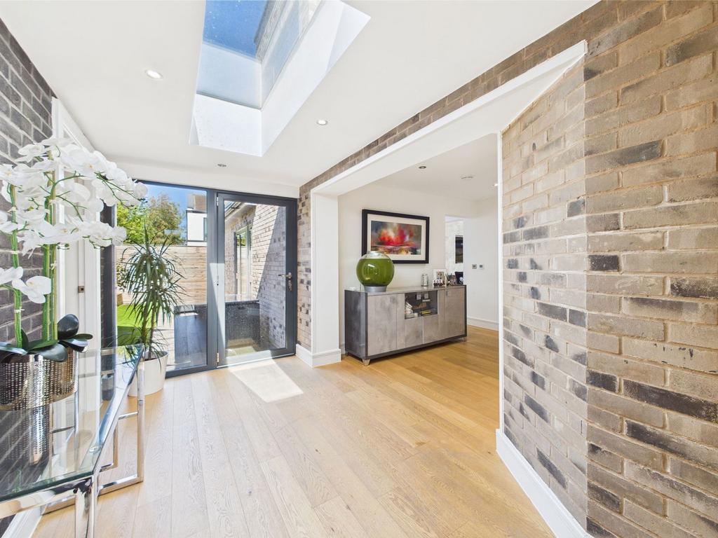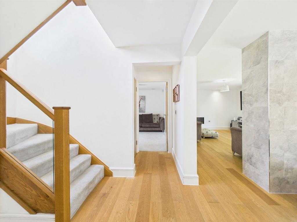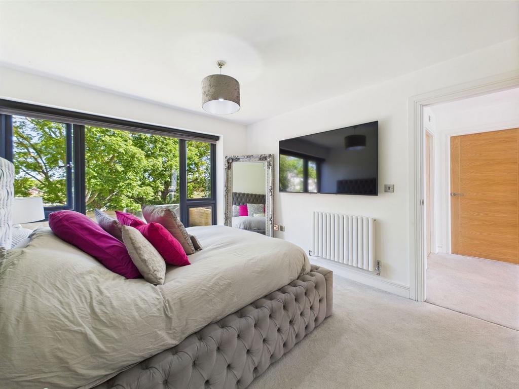 A striking glass and oak staircase leads to the first floor, where a large picture window floods the landing with natural light. Here, you’ll find four further double bedrooms and a beautifully appointed, contemporary family bathroom. The master suite is a true retreat, featuring a floor-to-ceiling window overlooking the rear garden, a walk-through dressing area, and a modern en-suite shower room.