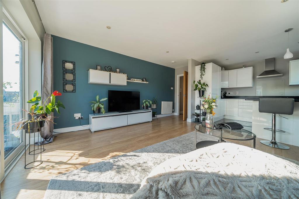 A communal hall with intercom point leads to the upper floors. The private inner hall is welcoming, and leads off to a useful storage cupboard with boiler and panel doors lead off. The property benefits from loft storage. The main reception space is an open plan living room and kitchen, providing an increased versatility for day to day life. A generous seating area has access to a walk out balcony, with a breakfast bar dividing the space with a well equipped kitchen sitting beyond. There is ample storage, built in appliances and contrasting granite worksurfaces over.
