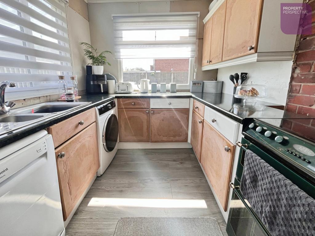 Kitchen - 4.96 x 2.37m (163" x 79") - High quality wood effect laminate flooring with access to the rear garden. A range of fitted kitchen units, worktops and space for free-standing kitchen appliances