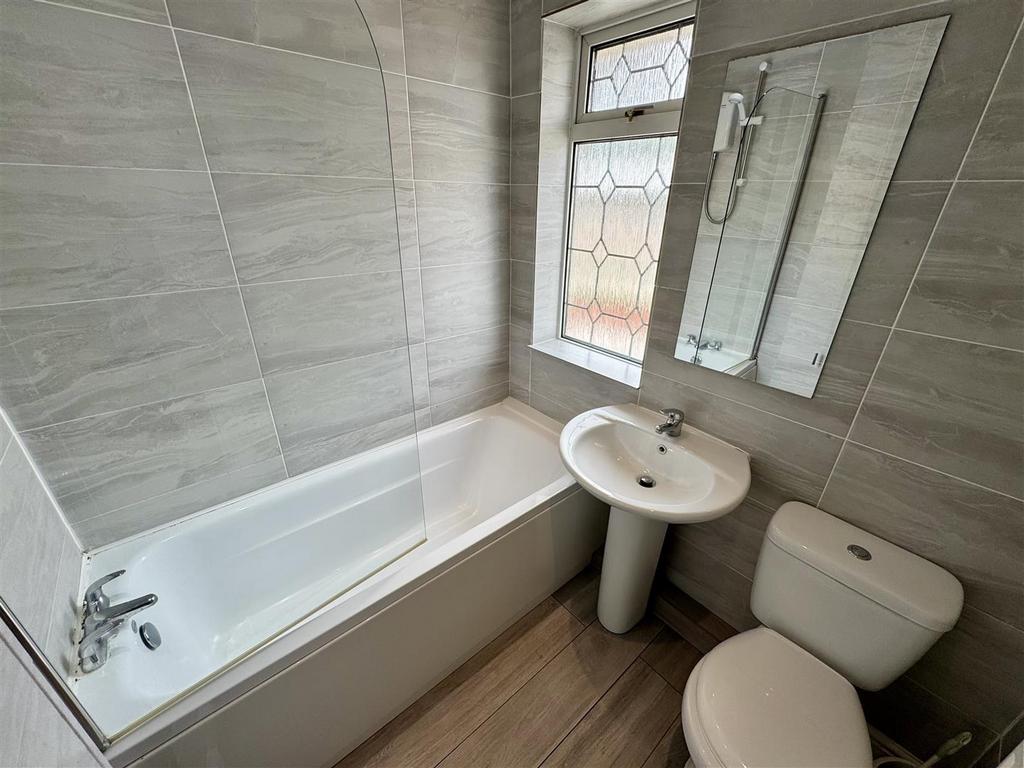 Bathroom - Bath with mixer tap and electric shower, double glazed window to front, wash hand basin with mixer tap, WC, central heating radiator and tiled walls.