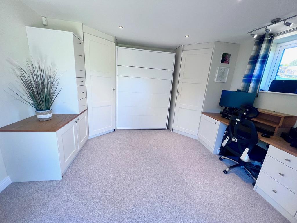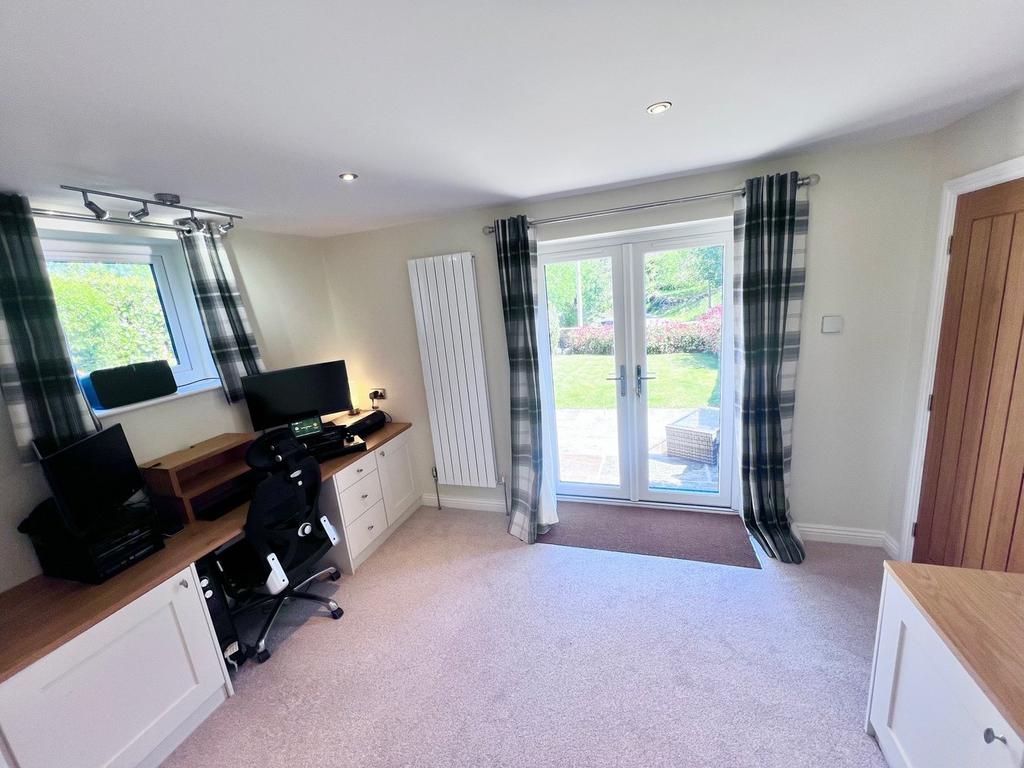 A flexible layout provides 3 spacious bedrooms and a fourth room ideal as a home office, snug, or guest bedroom. This room also opens onto its own patio, surrounded by a lawn and mature shrubs.