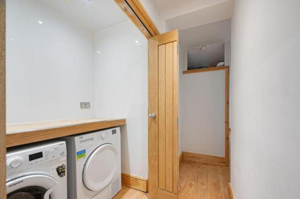 The modern kitchen is a true highlight, complete with sleek countertops, a breakfast bar, and abundant storage. An enclosed utility area provides discreet space for appliances and laundry needs.