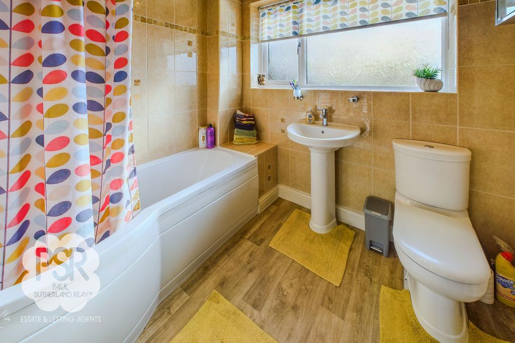 uPVC privacy double glazed window with fitted roller blinds to the rear elevation of the property, oak effect laminate flooring throughout, oak panelled ceiling with recessed ceiling spotlighting, a chrome ladder radiator fully tiled walls, and a matching bathroom suite comprises a low level WC with a button flush, a pedestal basin with a stainless steel mixer tap above, and a P-shaped bath with stainless steel deck mounted mixer taps and a wall mounted stainless steel thermostatic mixer shower above.