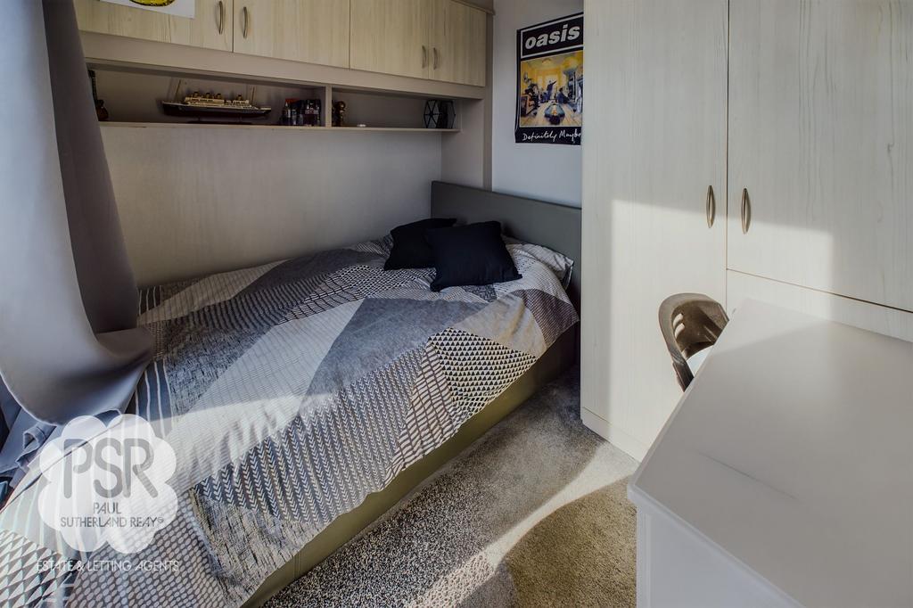 uPVC double glazed window with fitted Roman blinds to the front elevation of the property, carpeted flooring throughout, ceiling pendant lighting, a twin panel radiator and fitted wardrobe, chest of drawers, vanity station and over bed storage.