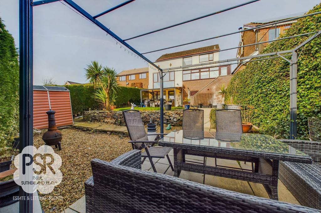 Large garden to the rear of the property accessed via steps from the conservatory, with a large under conservatory storage space, a lawned area, two pergolas with space for outdoor dining and entertaining, established plantings including a palm tree, and slate covered beds. Alley access to the front aspect.