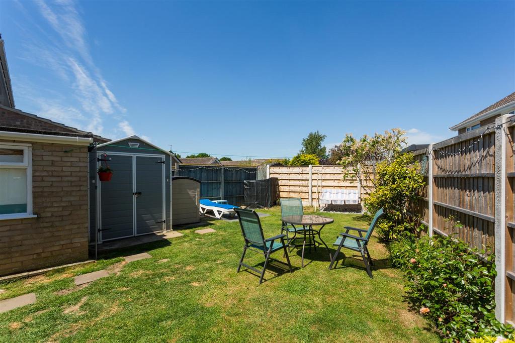 The patio steps up onto a shaped rear garden, which is extensively laid to lawn with herbaceous borders and surrounding fenced boundaries.