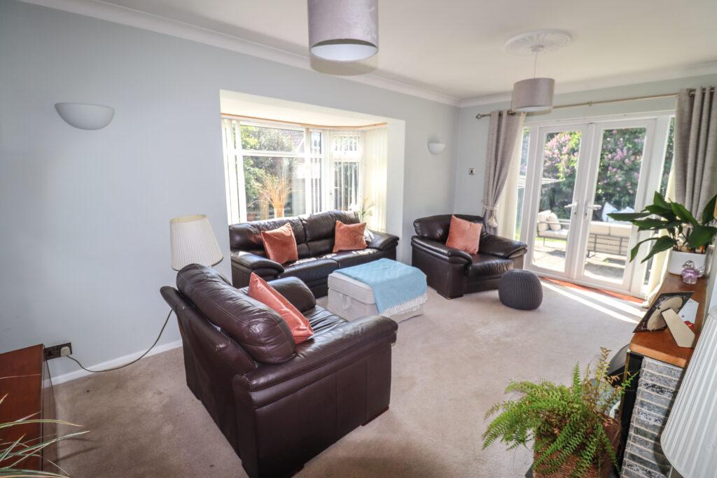 17'5" x 15' (5.30m x 4.57m) Five south facing UPVC double glazed windows in a bay to the side. Feature fireplace. Radiator, (with a fitted cover). Television point. Coved ceiling. Two wall lights. UPVC double glazed French doors leading to the rear garden. Feature fitted coal effect electric fire with an attractive surround. Two dimmer switches.
