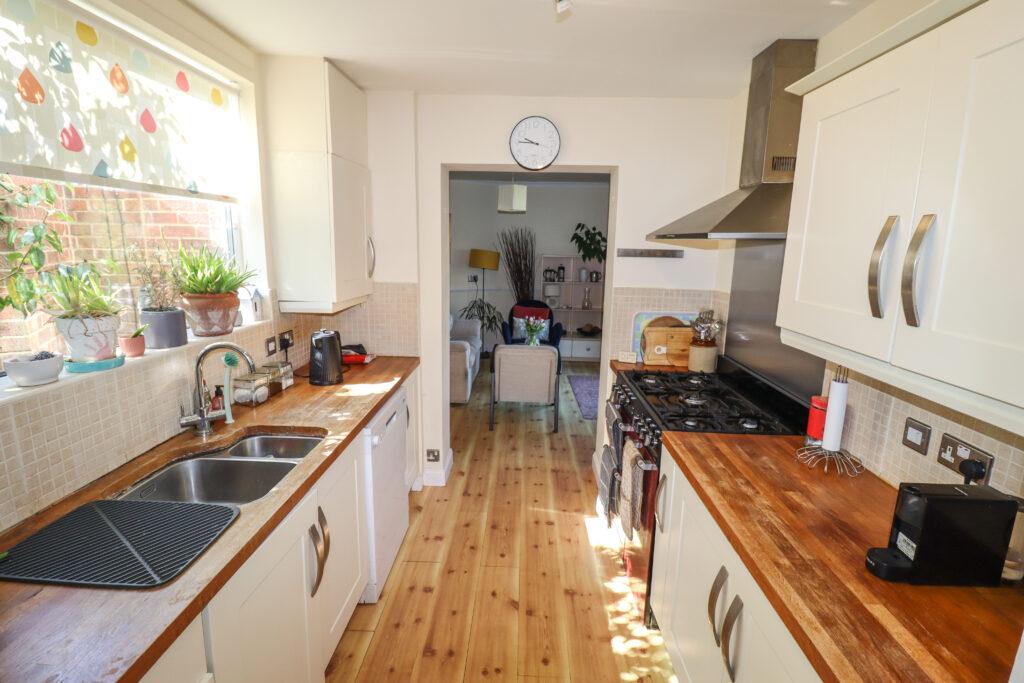 11' x 7'9" (3.35m x 2.36m) Fitted on two sides with attractive units. Range of worktops with drawers and cupboards under. Inset one and a quarter bowl stainless steel sink unit with mixer taps and a cupboard under. Matching high level cupboards. Wide recess with a Cookmaster Leisure oven with a five ring gas hob. Stainless steel extractor over. Recess with plumbing for a dishwasher. dishwasher. Recess for a fridge / freezer. Wall hung Worcester gas boiler in a matching unit. Four multi-directional ceiling spotlights. Feature wood flooring. Wide UPVC double glazed window to the front. Access through to: