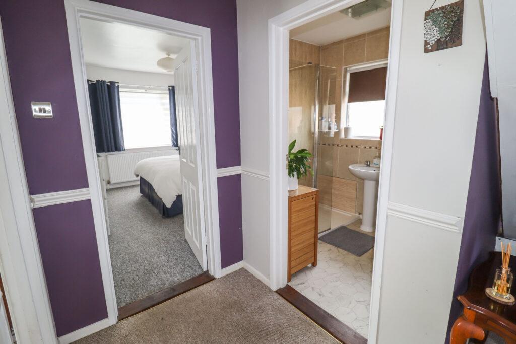 Fitted with an attractive white suite. Low level WC. Feature vanity wash hand basin with mixer taps and a cupboard under. Fully tiled shower enclosure with an Mira shower. Walls fully tiled. Fitted mirror. Chrome heated towel rail / radiator. Inset ceiling spotlights. UPVC double glazed window with obscured glass to the side.