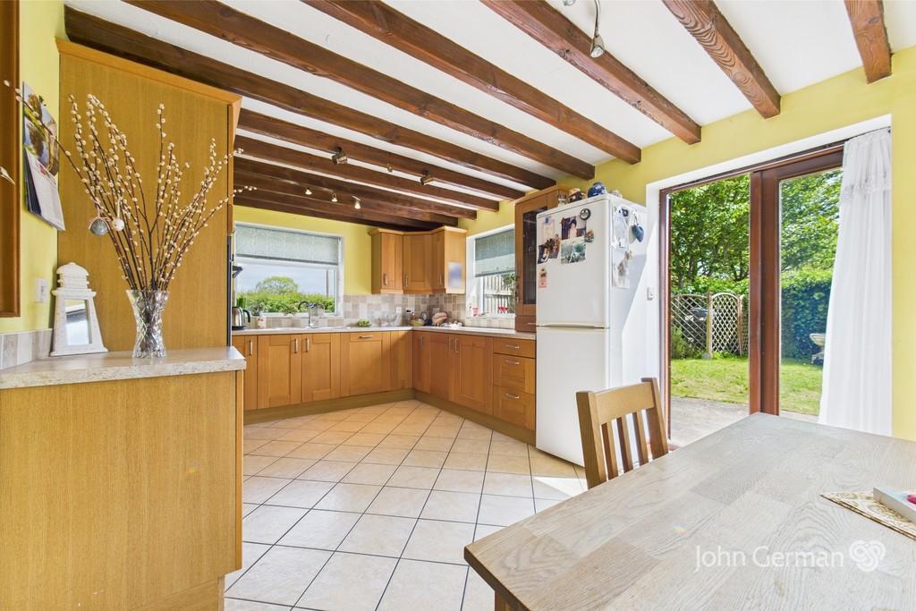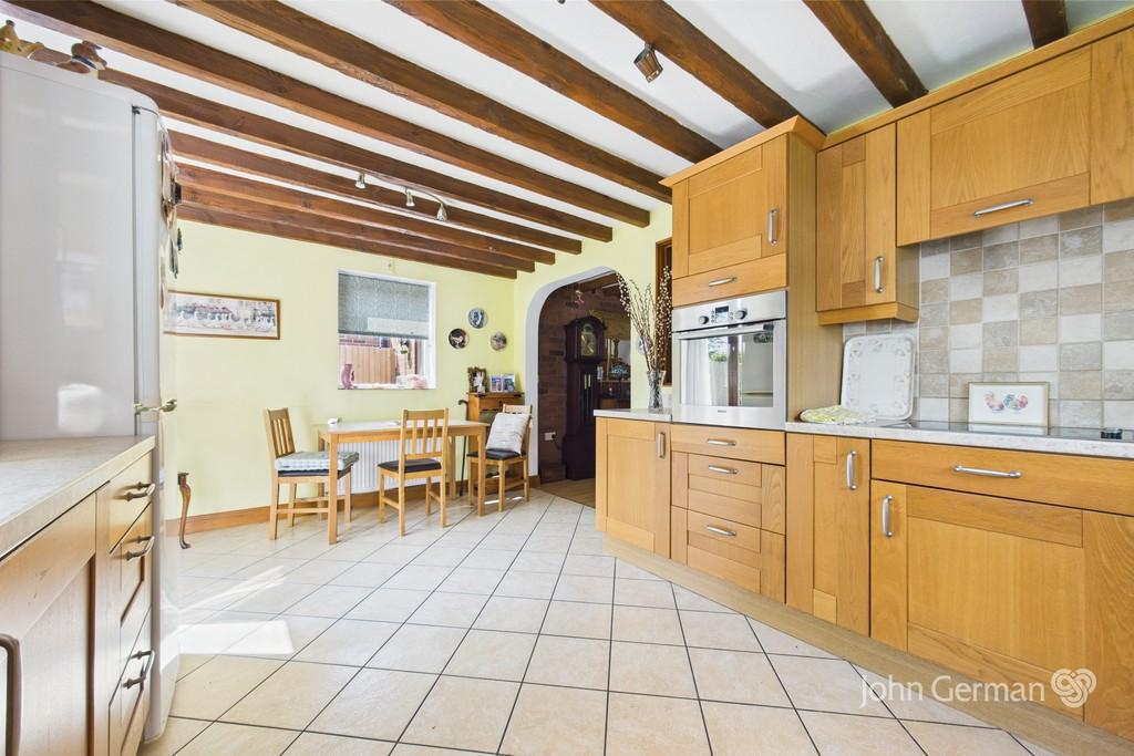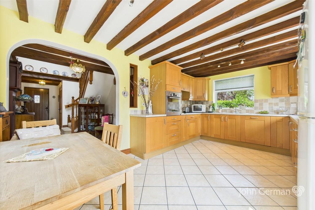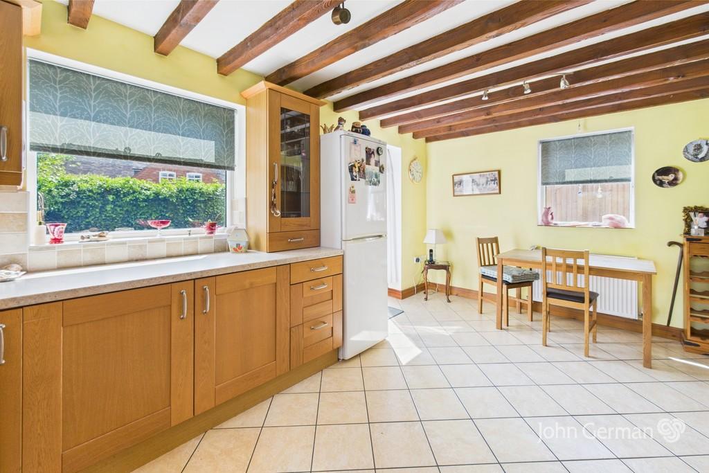 The wide dual aspect fitted dining kitchen has a range of base and eye level units with worktops and an inset sink unit set below the side facing window enjoying a pleasant outlook, fitted electric hob with an extractor over, built in electric oven, plumbing for a dishwasher and space for a fridge freezer. Additional light comes from the wide French doors opening to the pleasant garden and patio.